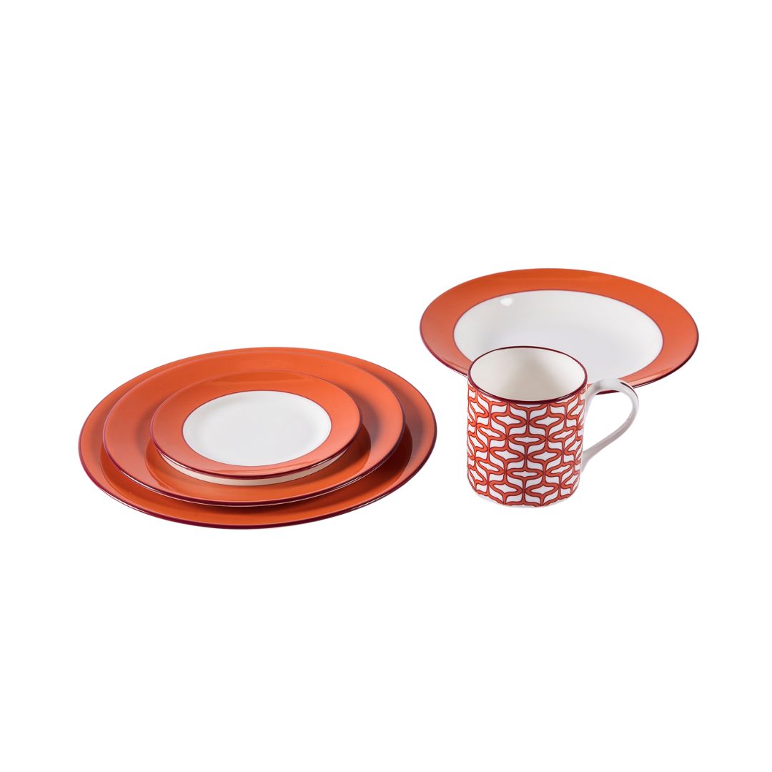 Full set: 1x dinner plate (27cm), 1x pudding plate (23cm), 1x rimmed soup bowl (23cm), 1x side plate (16cm) & 1x mug