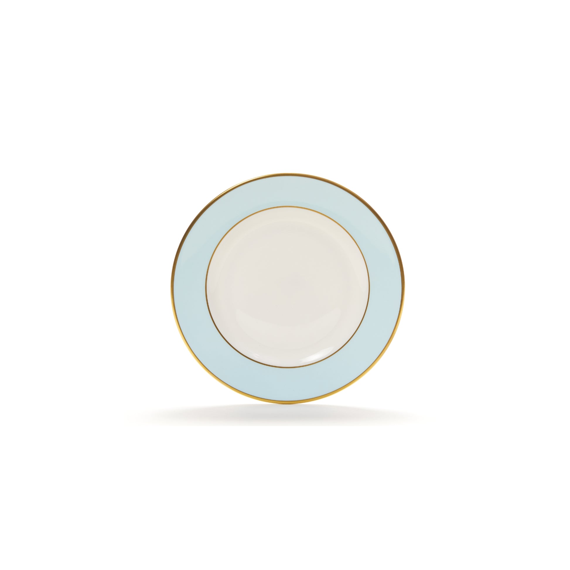 A sensational pale blue evoking soft skies and cool water, the full colour border on this elegant side plate is silk-screen printed on to hand-crafted fine bone china. Each plate is hand-painted with a 24k burnished gold double rim.