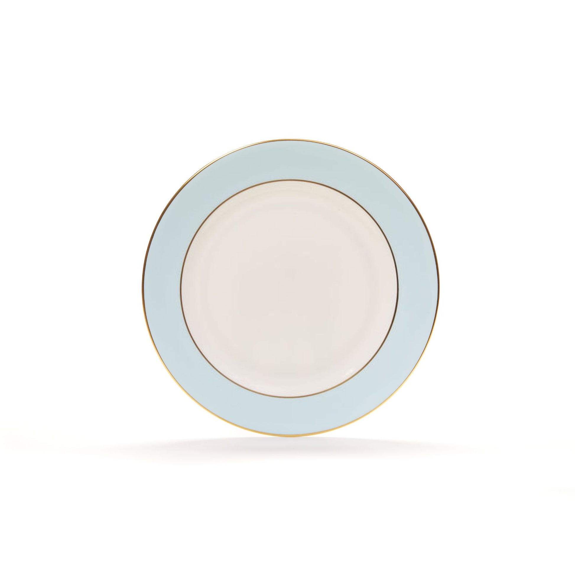 A soothing pale blue evoking soft skies and cool water, the full colour border is printed by lithograph and delicately sponged on to a hand-crafted plate. It is then trimmed with two luxurious, hand-painted gold bands. Each piece has a 'rolled edge' meaning the gold can be seen from the side and above.